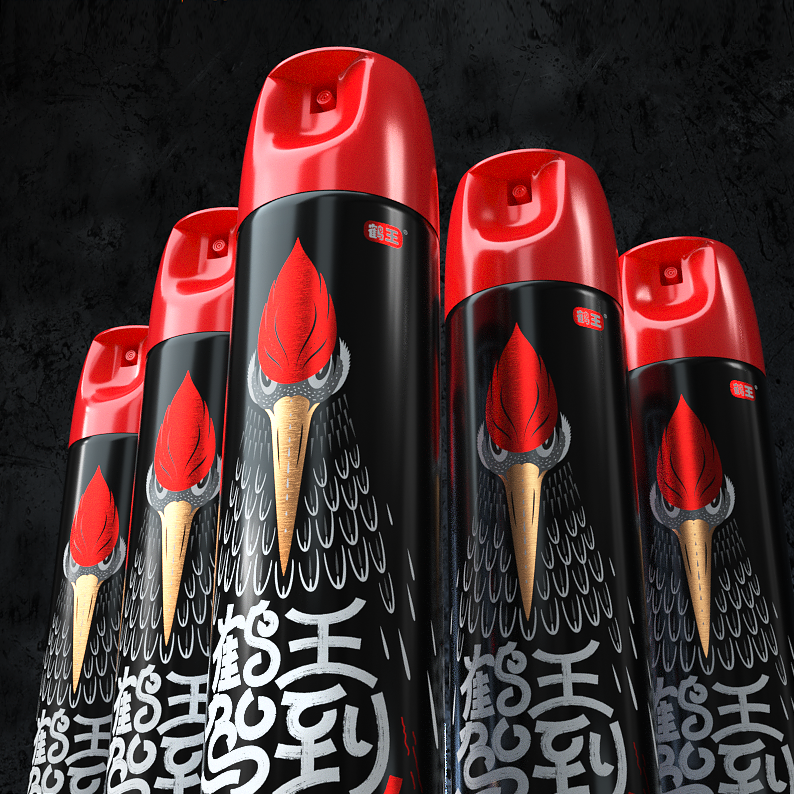 鶴王,顧名思義,鶴立雞群,王者也。通過現(xiàn)代藝術(shù)的插畫表現(xiàn)形式詮釋品牌,創(chuàng)意圖案由上至下為三角形,如按壓噴嘴瞬間的噴霧造形。