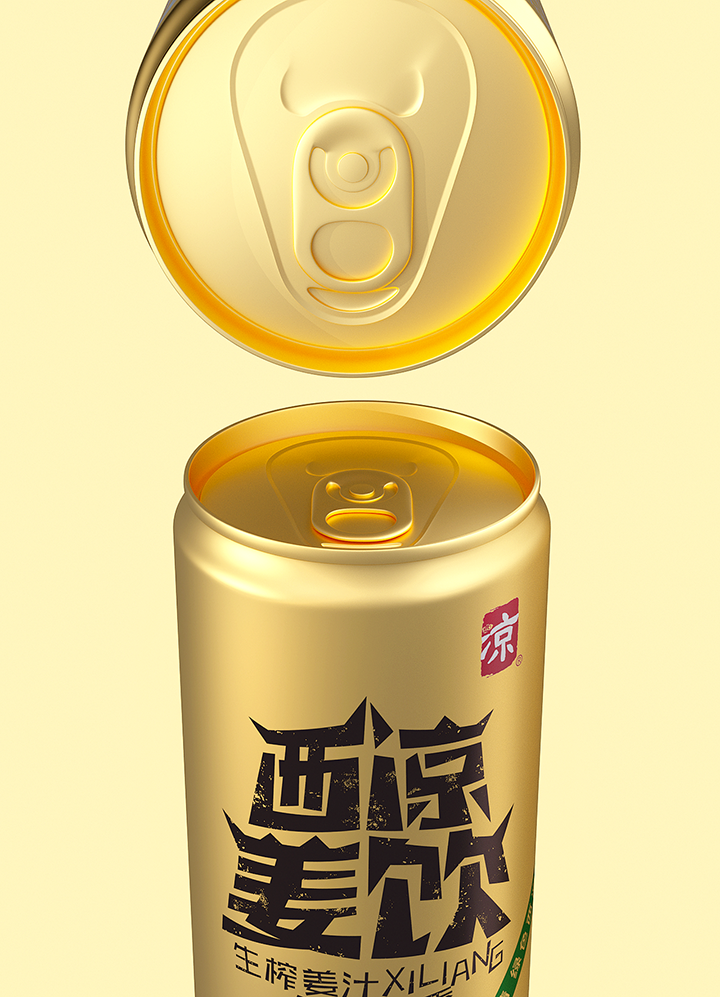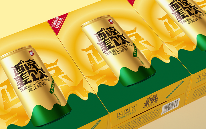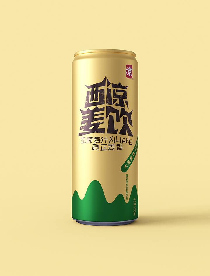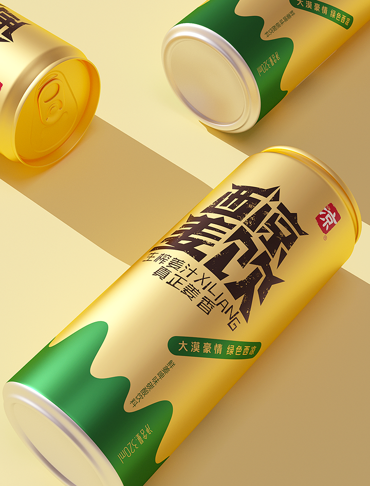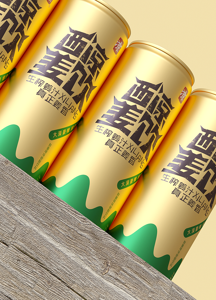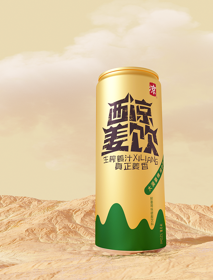 Xiliang ginger drink adopts the traditional technology of raw ginger juice to ensure the quality and taste of the product. The creativity combines Jiayuguan, desert, oasis, ginger juice and other elements, the font design of the brand name is Jiayuguan shape, the golden tank body and oasis ingeniously combine to form the sense of golden ginger juice flowing down. Color and shape are oases in the desert, expressing the meaning of precious water source. The golden pot is like an endless desert, and the golden ginger juice forms a positive and negative shape with the lower oasis, which skillfully shows the feeling of golden ginger juice overflowing from the mouth of the jar. The new design gives a new image to Xiliang ginger drink, which has the personality of Northwest China and contains the characteristic positioning of the product.
