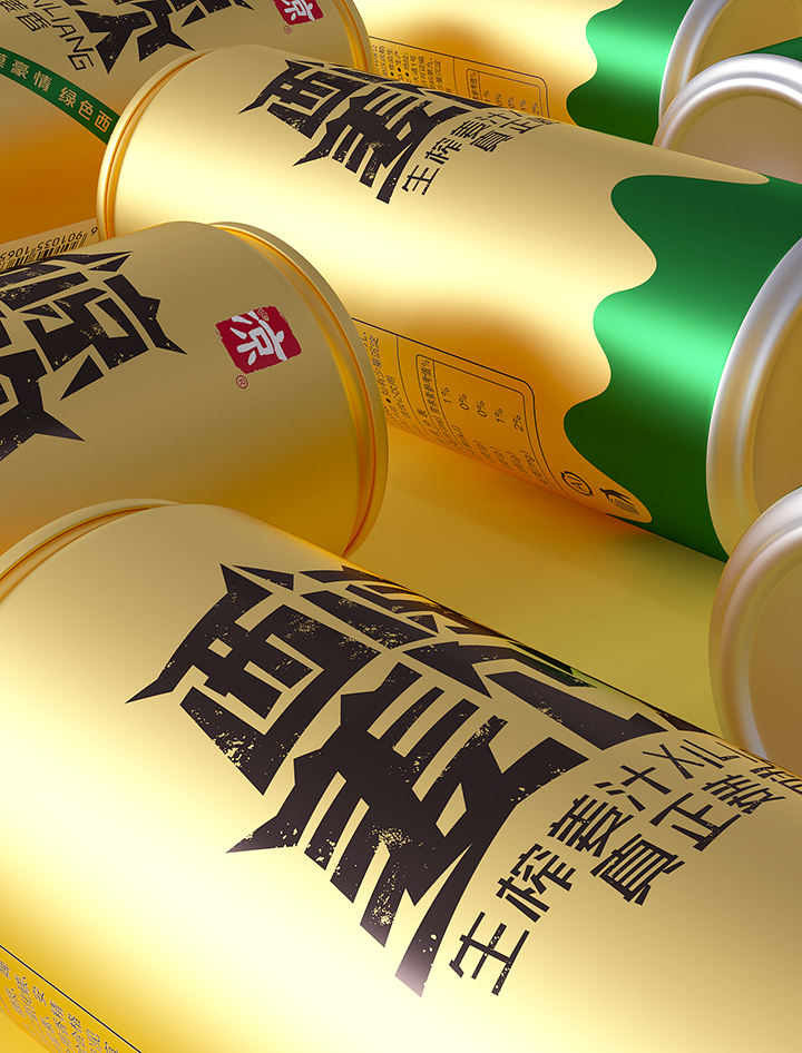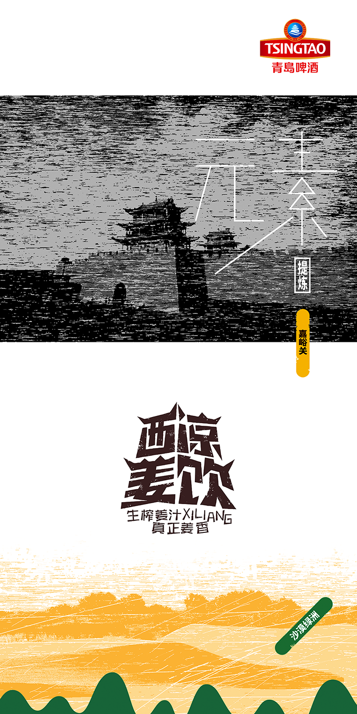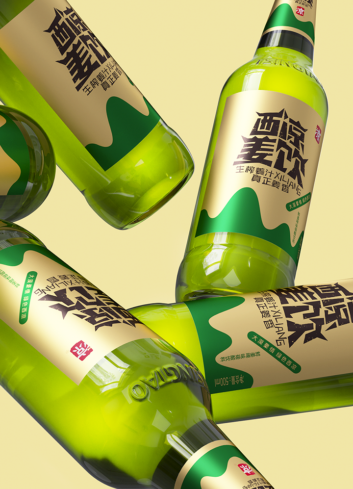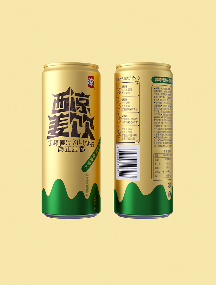 Xiliang ginger drink adopts the traditional technology of raw ginger juice to ensure the quality and taste of the product. The creativity combines Jiayuguan, desert, oasis, ginger juice and other elements, the font design of the brand name is Jiayuguan shape, the golden tank body and oasis ingeniously combine to form the sense of golden ginger juice flowing down. Color and shape are oases in the desert, expressing the meaning of precious water source. The golden pot is like an endless desert, and the golden ginger juice forms a positive and negative shape with the lower oasis, which skillfully shows the feeling of golden ginger juice overflowing from the mouth of the jar. The new design gives a new image to Xiliang ginger drink, which has the personality of Northwest China and contains the characteristic positioning of the product.