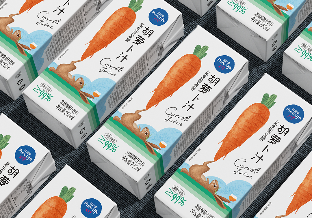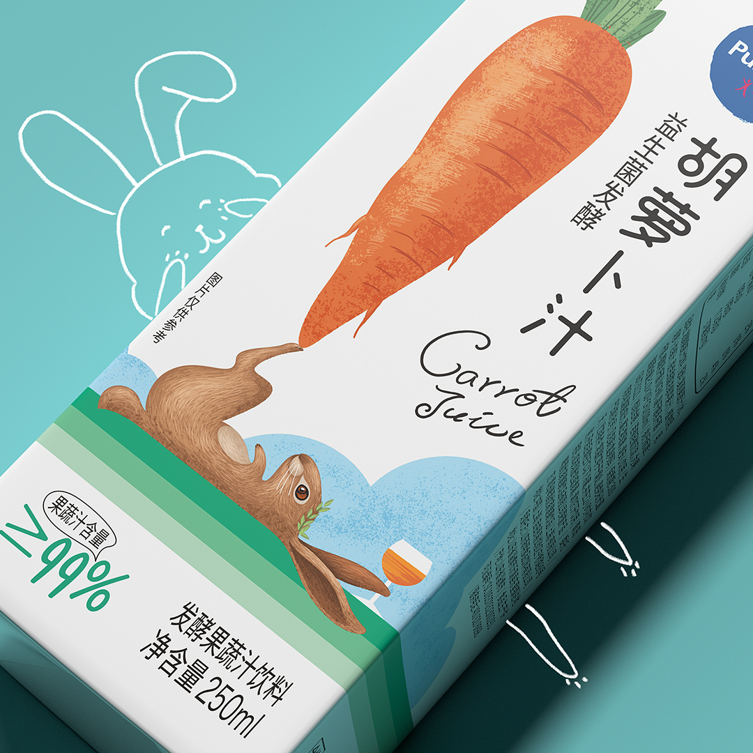 包裝設(shè)計創(chuàng)意直觀體現(xiàn)了產(chǎn)品品類屬性及胡蘿卜汁的賣點,同時形成自身個性化形象符號識別,通過設(shè)計表現(xiàn)強化與同類產(chǎn)品差異化訴求。
