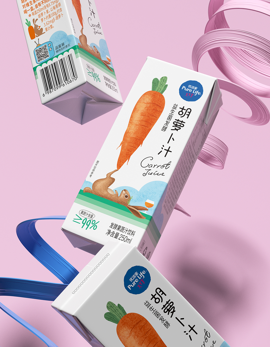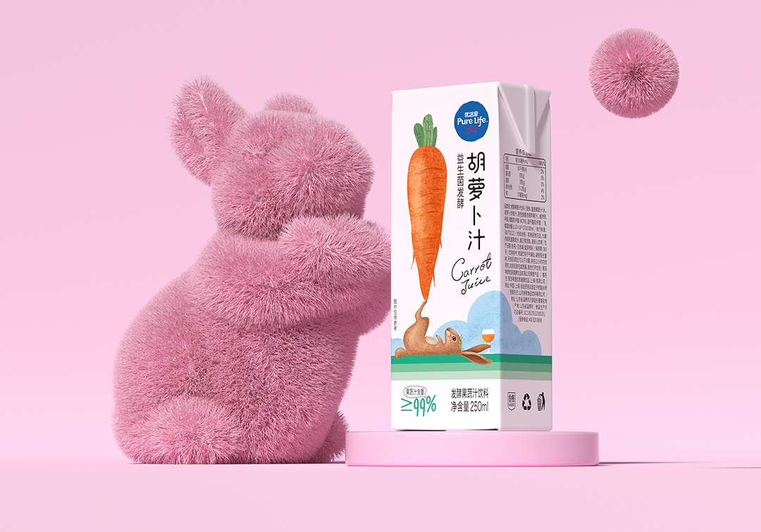 優(yōu)活家胡蘿卜汁每盒相當(dāng)于2.5根胡蘿卜的營養(yǎng),包裝設(shè)計主圖案采用手繪形式表現(xiàn),軟萌可愛的外表,趣味十足,讓人有想要品嘗的感受。